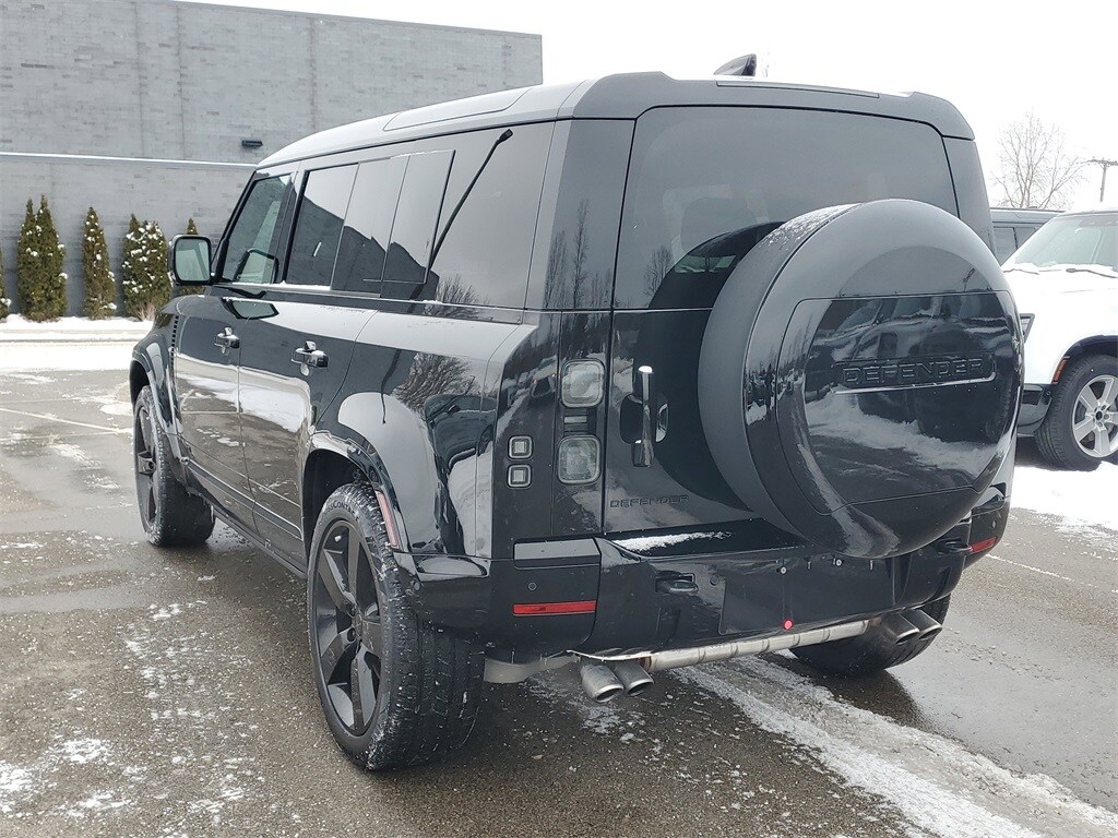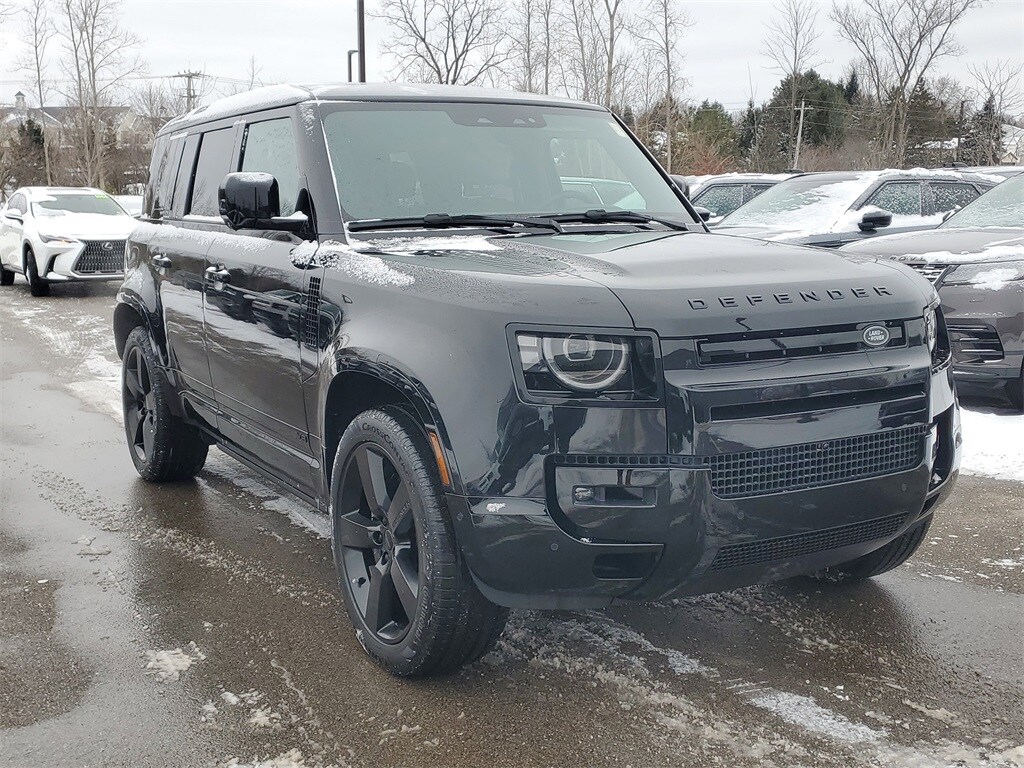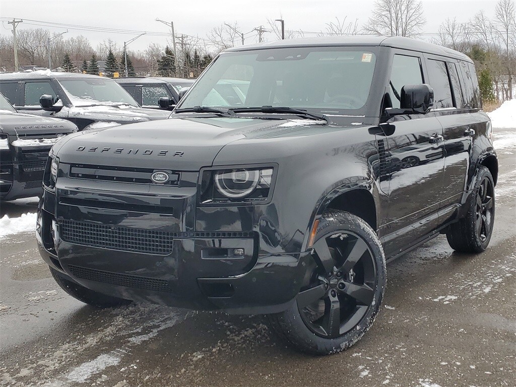 Santorini Black 2026 Land Rover Defender 110 V8 AWD 8-Speed Automatic V8 Supercharged 14-Way Heated and Cooled Electric Memory Front Seats, 15 Speakers, 4-Wheel Disc Brakes, ABS brakes, Adaptive suspension, Air Conditioning, Alloy wheels, AM/FM radio: SiriusXM, Apple CarPlay & Android Auto, Auto High-beam Headlights, Auto tilt-away steering wheel, Auto-dimming door mirrors, Auto-dimming Rear-View mirror, Automatic temperature control, Brake assist, Bumpers: body-color, Compass, Delay-off headlights, Driver door bin, Driver vanity mirror, Dual front impact airbags, Dual front side impact airbags, Electronic Stability Control, Exterior Parking Camera Rear, Four wheel independent suspension, Front anti-roll bar, Front Bucket Seats, Front Center Armrest, Front dual zone A/C, Front fog lights, Front reading lights, Fully automatic headlights, Garage door transmitter: HomeLink, Headlight cleaning, Heads-Up Display, Heated door mirrors, Heated front seats, Heated rear seats, Heated steering wheel, Illuminated entry, Leather Shift Knob, Leather steering wheel, Low tire pressure warning, Memory seat, Navigation system: Connected Navigation PIVI Pro, Occupant sensing airbag, Outside temperature display, Overhead airbag, Overhead console, Panic alarm, Passenger door bin, Passenger vanity mirror, Power door mirrors, Power driver seat, Power moonroof, Power passenger seat, Power steering, Power windows, Radio data system, Radio: Meridian Surround Sound System, Rain sensing wipers, Rear air conditioning, Rear anti-roll bar, Rear fog lights, Rear reading lights, Rear seat center armrest, Rear window defroster, Rear window wiper, Remote keyless entry, Security system, Speed control, Speed-sensing steering, Speed-Sensitive Wipers, Split folding rear seat, Steering wheel memory, Steering wheel mounted audio controls, Tachometer, Telescoping steering wheel, Tilt steering wheel, Traction control, Trip computer, Variably intermittent wipers, Ventilated front seats, Weather band radio, Wheels: 22" Dark Grey Diamond Turned Style 7030, Windsor Leather and Kvadrat Seat Trim.