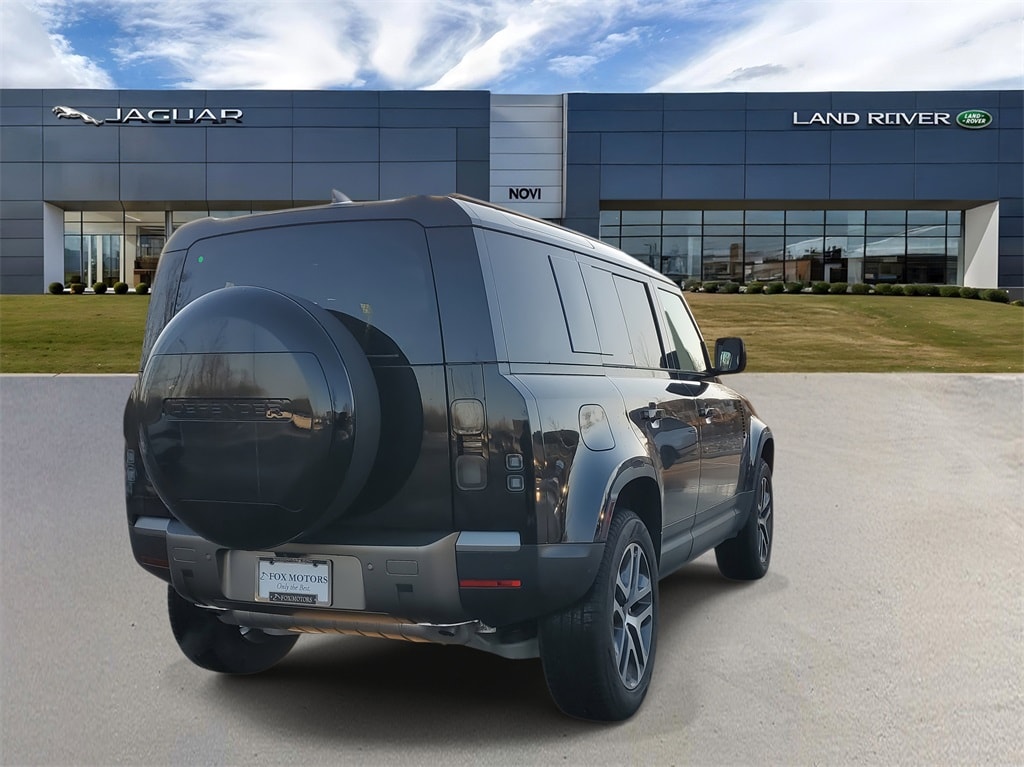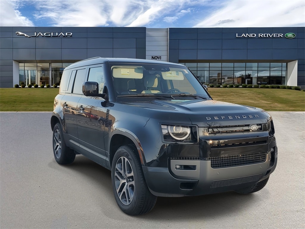 Santorini Black 2026 Land Rover Defender 110 S AWD 8-Speed Automatic 2.0L I4 DI Turbocharged 11 Speakers, 12-Way Heated Electric Memory Front Seats, 4-Wheel Disc Brakes, ABS brakes, Air Conditioning, Alloy wheels, AM/FM radio: SiriusXM, Apple CarPlay & Android Auto, Auto High-beam Headlights, Auto tilt-away steering wheel, Auto-dimming door mirrors, Auto-dimming Rear-View mirror, Automatic temperature control, Brake assist, Bumpers: body-color, Compass, Delay-off headlights, Driver door bin, Driver vanity mirror, Dual front impact airbags, Dual front side impact airbags, Electronic Stability Control, Exterior Parking Camera Rear, Four wheel independent suspension, Front anti-roll bar, Front Bucket Seats, Front Center Armrest, Front dual zone A/C, Front fog lights, Front reading lights, Fully automatic headlights, Garage door transmitter: HomeLink, Heated door mirrors, Heated front seats, Heated steering wheel, Illuminated entry, Low tire pressure warning, Memory seat, Navigation system: Connected Navigation PIVI Pro, Occupant sensing airbag, Outside temperature display, Overhead airbag, Overhead console, Panic alarm, Passenger door bin, Passenger vanity mirror, Power door mirrors, Power driver seat, Power moonroof, Power passenger seat, Power steering, Power windows, Radio data system, Radio: Meridian Sound System, Rain sensing wipers, Rear anti-roll bar, Rear fog lights, Rear reading lights, Rear seat center armrest, Rear window defroster, Rear window wiper, Remote keyless entry, Resist and Resolve Seat Trim, Security system, Speed control, Speed-sensing steering, Speed-Sensitive Wipers, Split folding rear seat, Steering wheel memory, Steering wheel mounted audio controls, Tachometer, Telescoping steering wheel, Tilt steering wheel, Traction control, Trip computer, Variably intermittent wipers, Weather band radio, Wheels: 19" Gloss Sparkle Silver Style 6010.